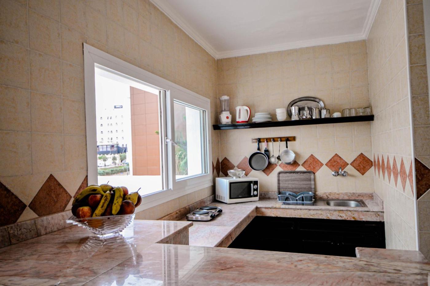 One-Bedroom Apartment. Featuring a balcony with views of the pool, the sea or the city, this air-conditioned apartment includes a fully equipped kitchenette with an orange press, blender, hot plates, microwave, refrigerator, electric kettle and kitchenware. It has access to a shared bathroom and additional facilities include a flat-screen TV and a telephone. ;