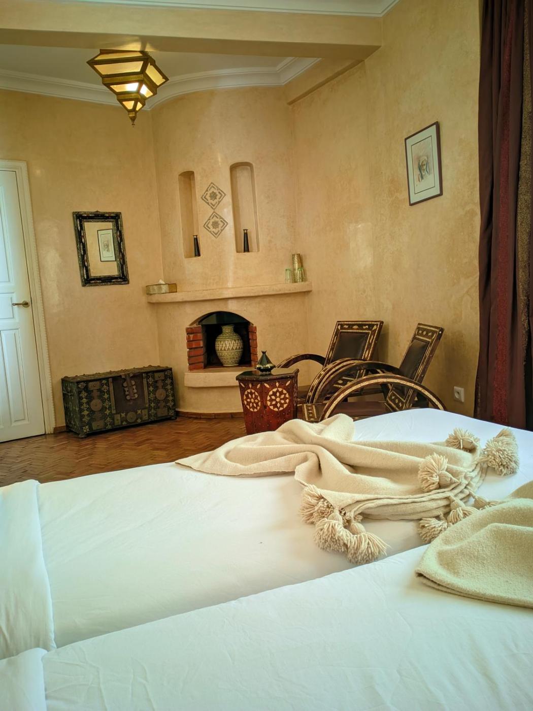 Laaouina Twin Room. Situated on the second floor, this room features a seating area with a fireplace and a private bathroom with aubergine tadelakt and a round bath. ;