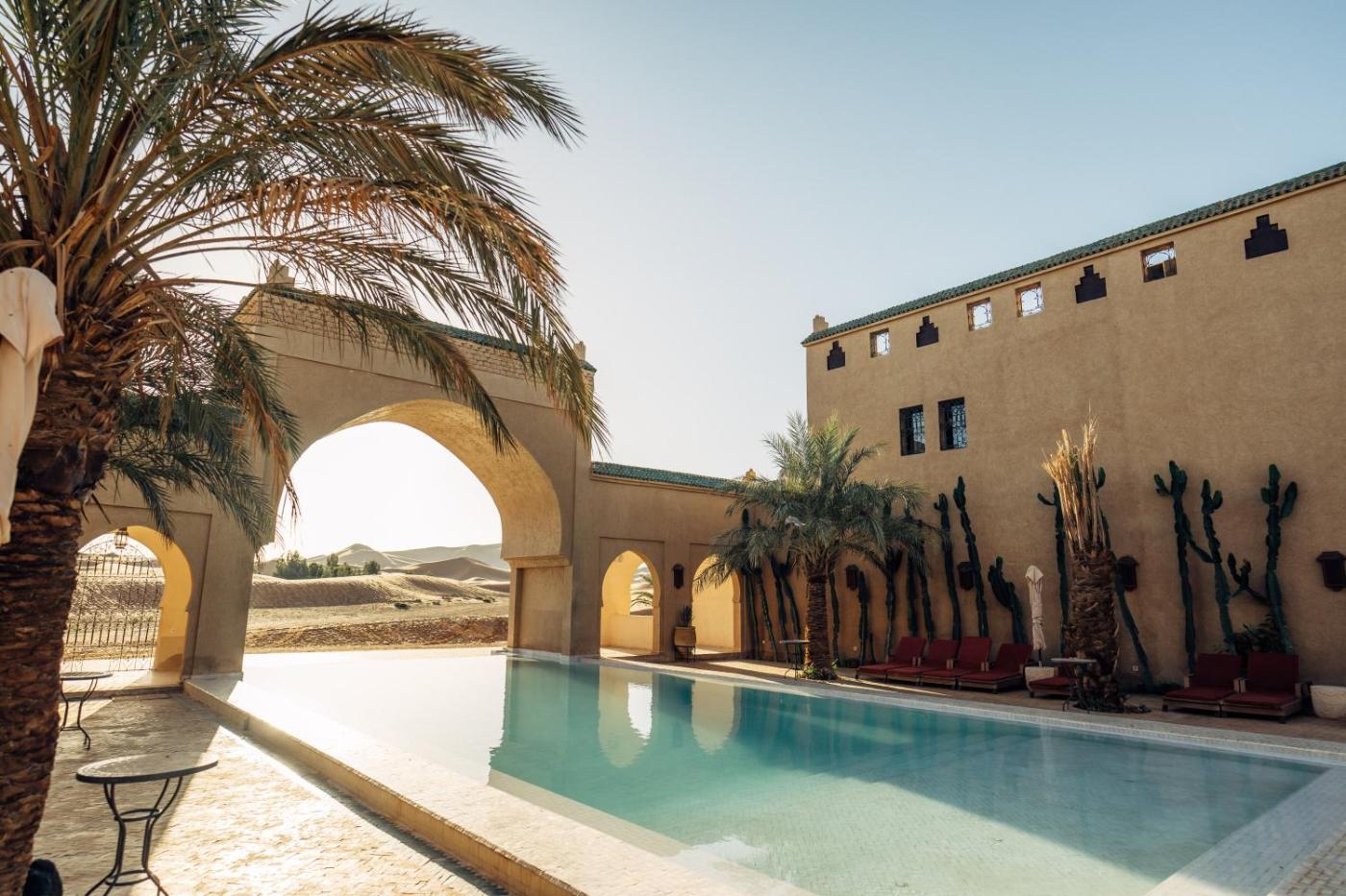 Sahara pearl Hotel features a garden, shared lounge, a terrace and restaurant in Merzouga. Featuring an outdoor swimming pool, the 4-star hotel has air-conditioned rooms with free WiFi, each with a private bathroom. There is free private parking and the property offers paid airport shuttle service.