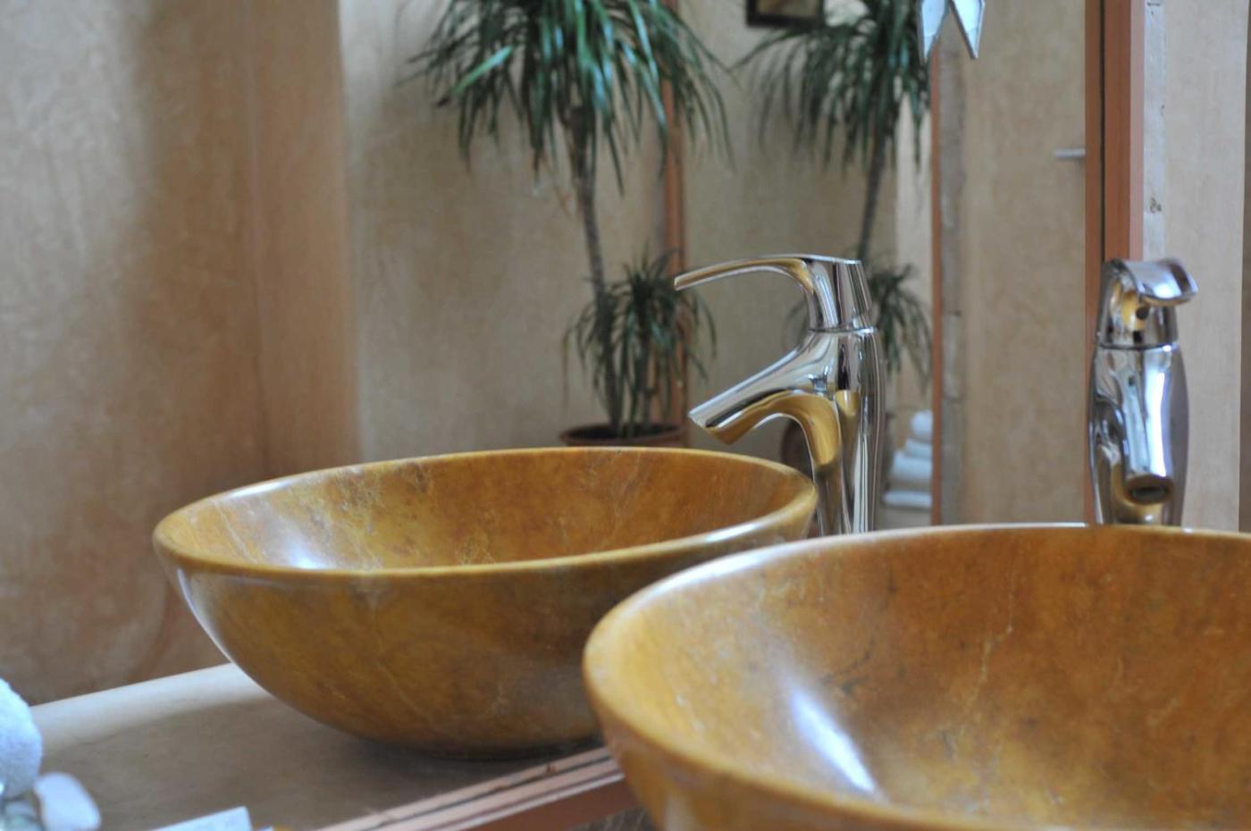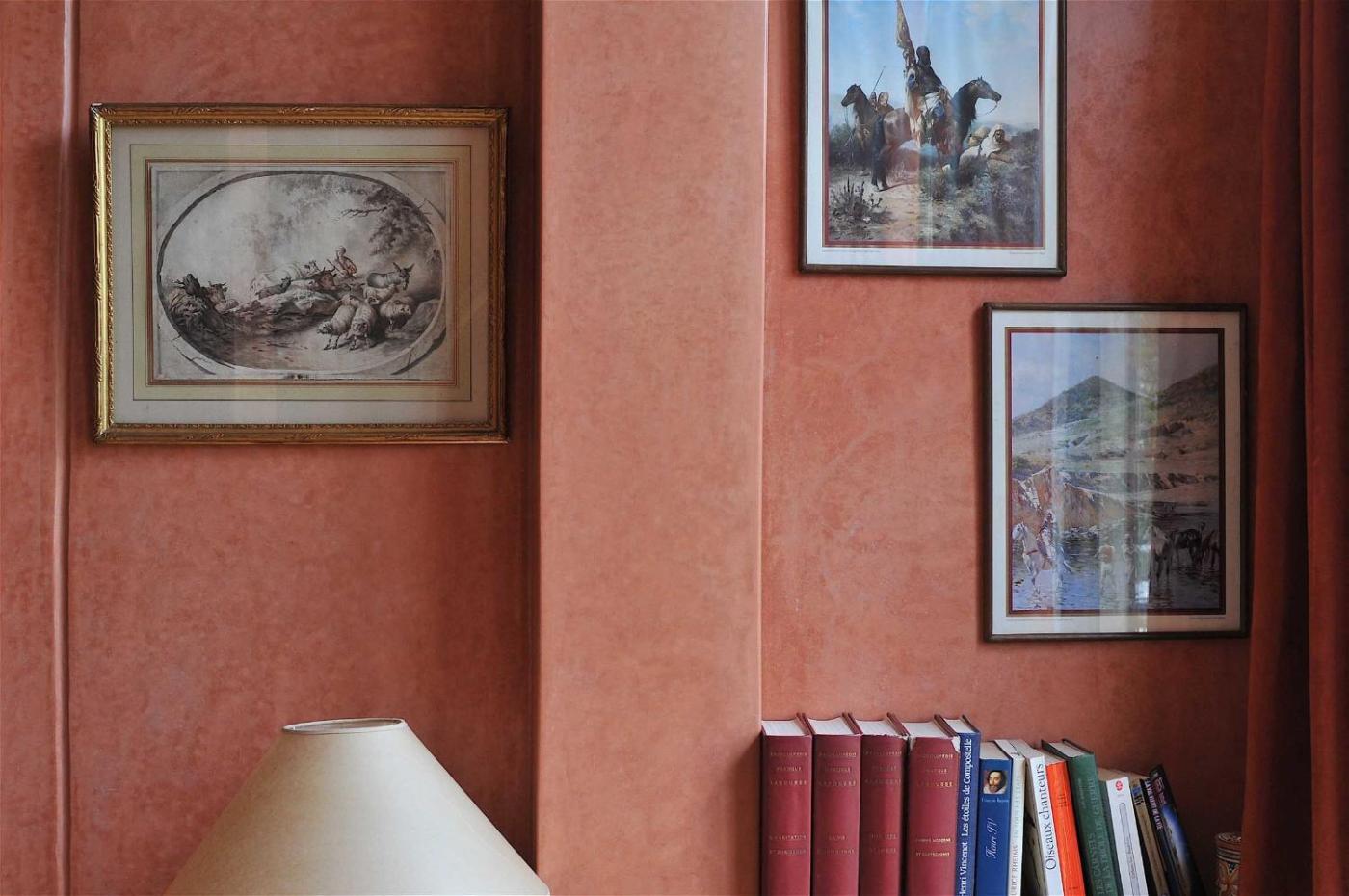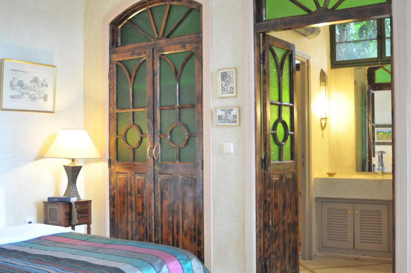 Room 5. Decorated in warm tones, this room features a reversible air-conditioning, Moroccan paintings and a terrace with garden and pool views. The private bathroom is fitted with a bathtub. ;